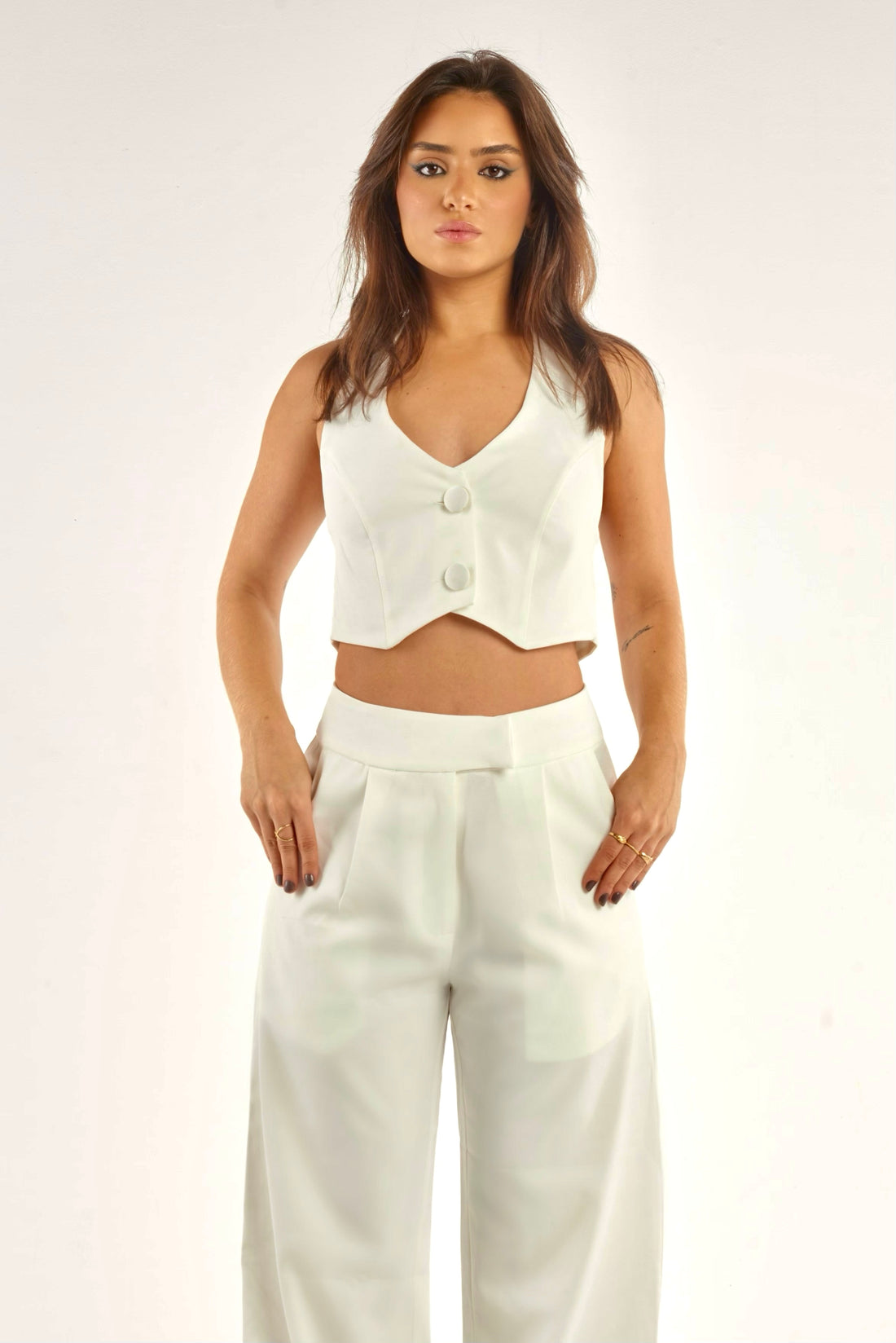 Colete em crepe de alfaiataria. Frente única, possui decote em V e fecho por botões...