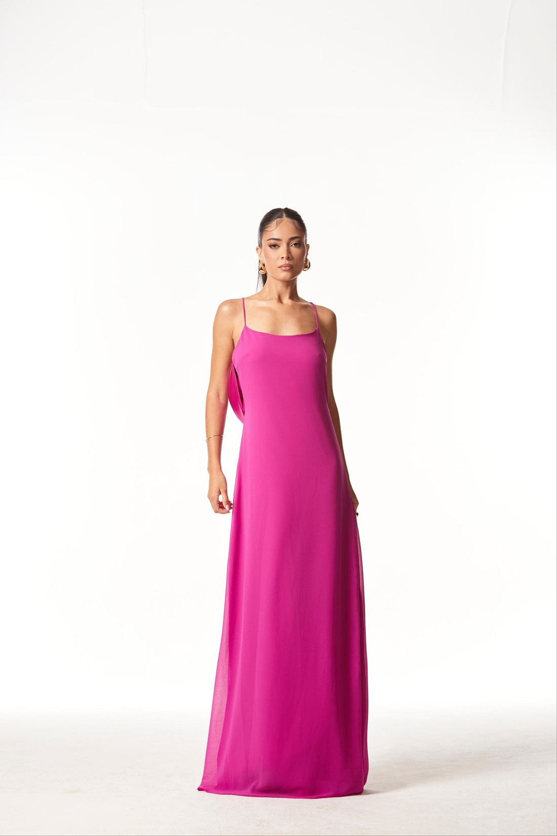 Vestido longo com com corte reto, possui decote profundo nas costas, confeccionado em tecido georgette...