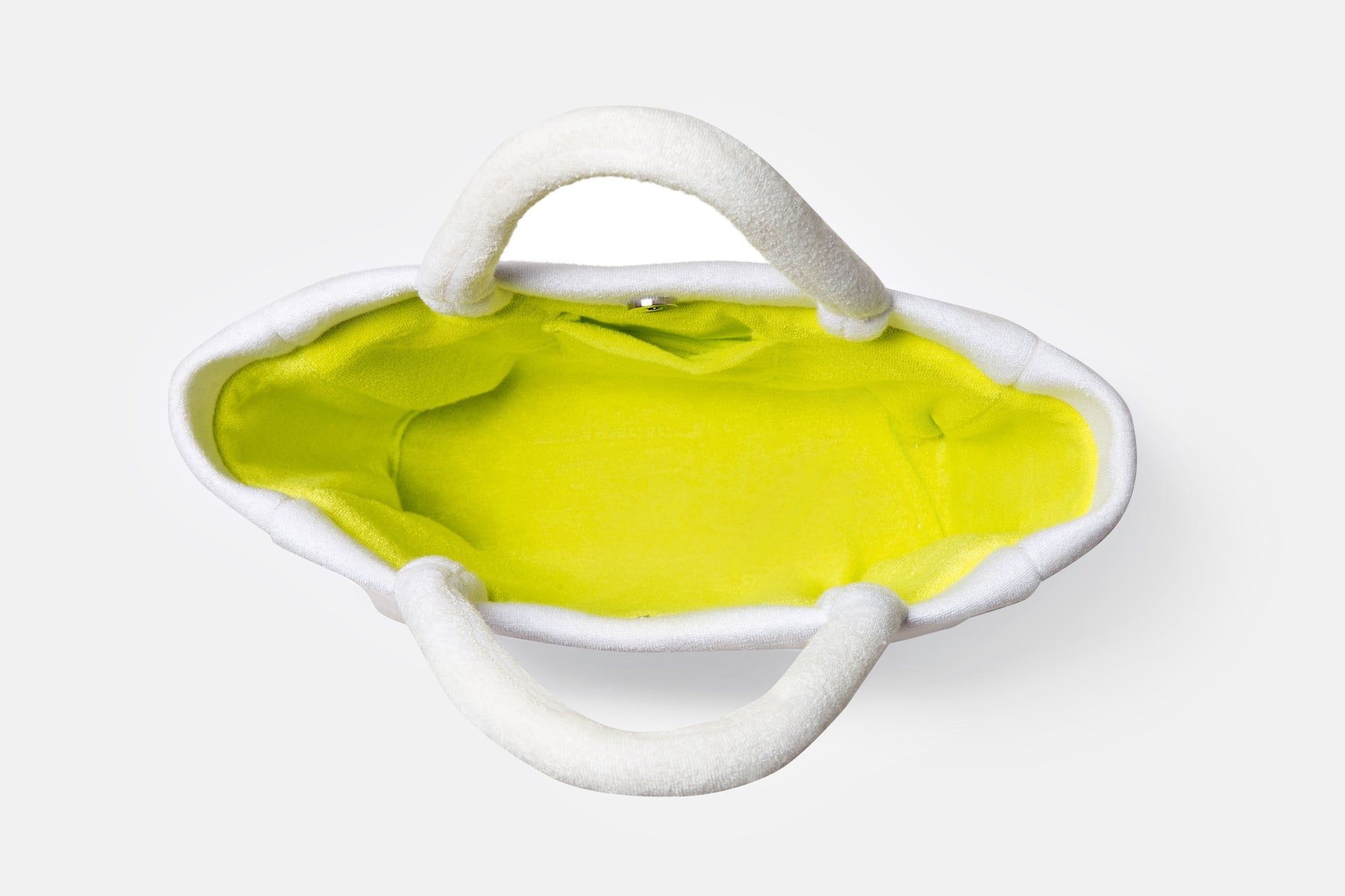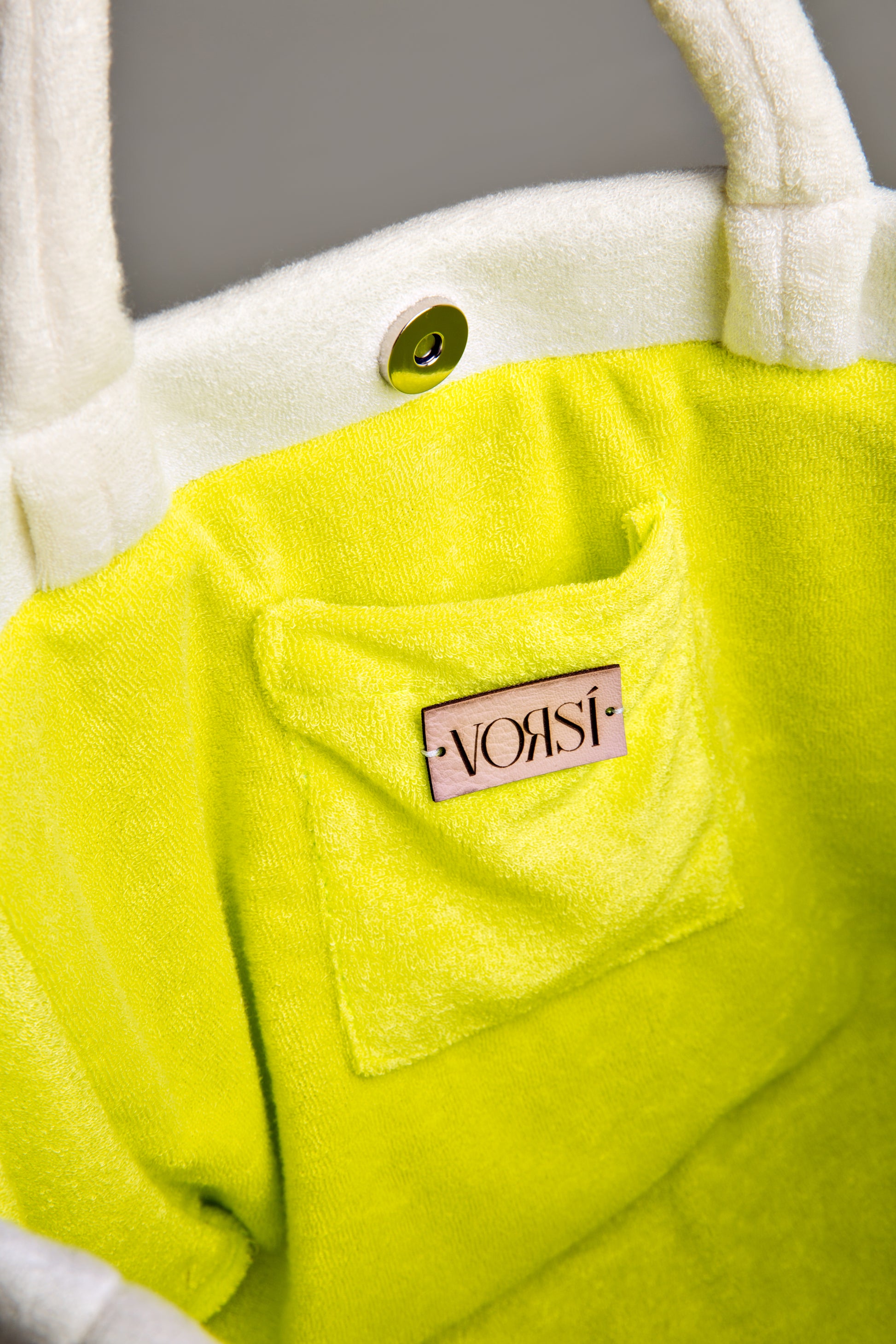 Bolsa tote atoalhada off com forro interno atoalhado verde lima. Fecho de imã e bolso interno. Acompanha Dust bag de cetim e almofada para manter estrutura da bolsa quando guardada.