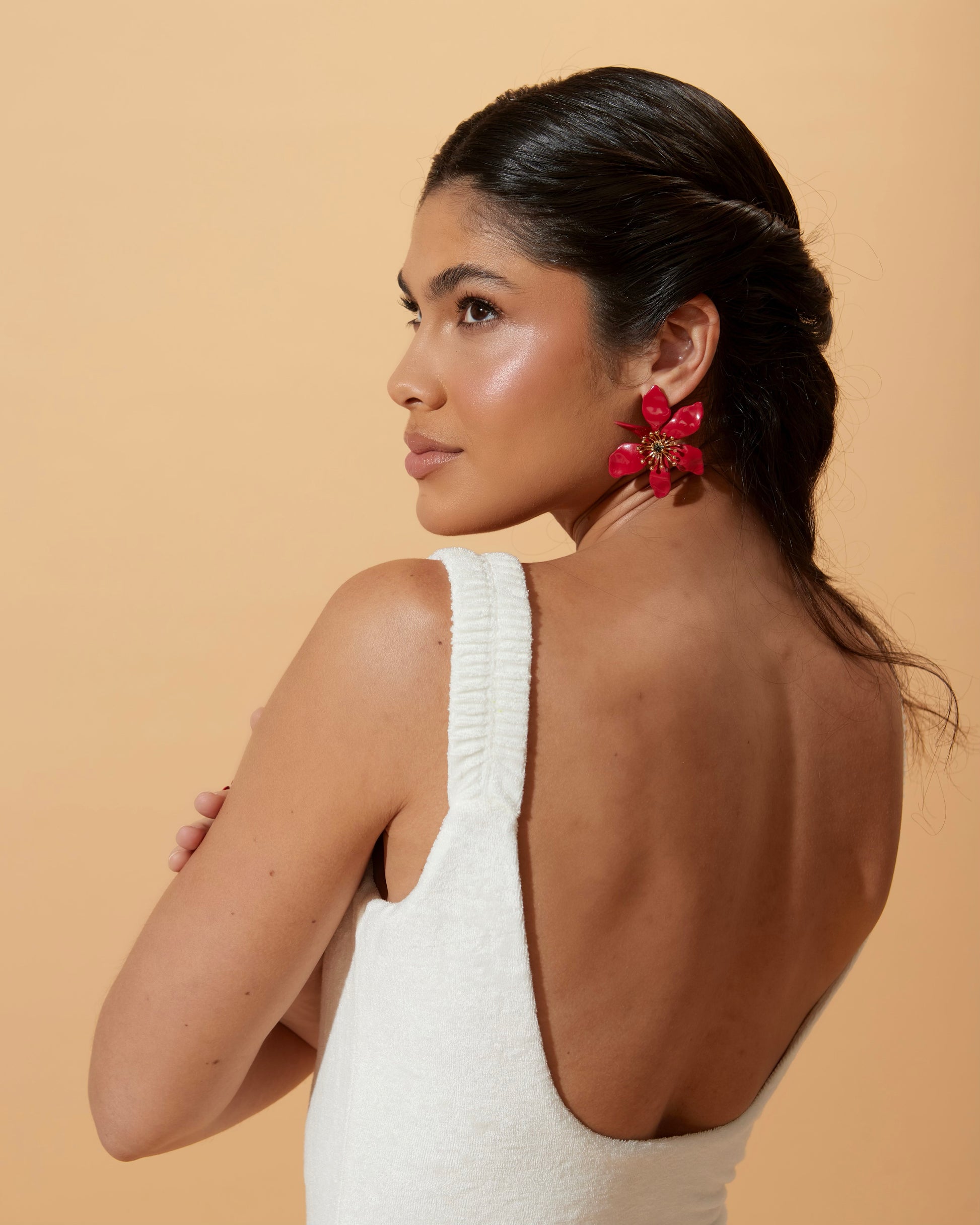 Body confeccionado em malha atoalhada com decote frontal reto e abertura nas costas com decote em U. Possui alças em elástico.
