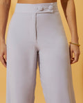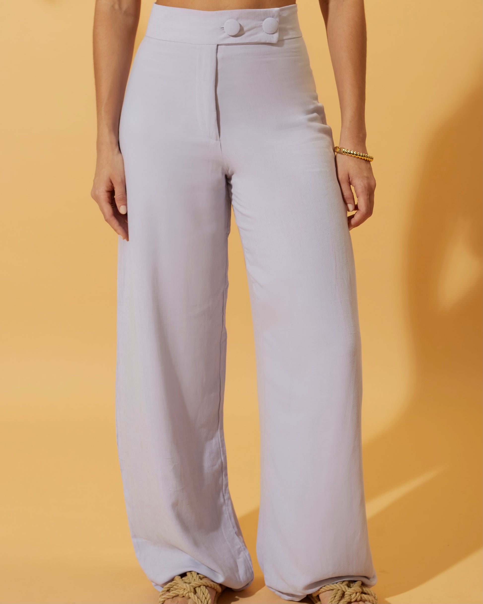 Calça cintura alta, confeccionada em linho com viscose. Modelagem ampla e fechamento frontal com botão de segurança transparente interno e dois botões forrados externos.