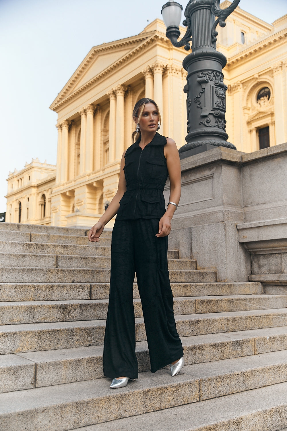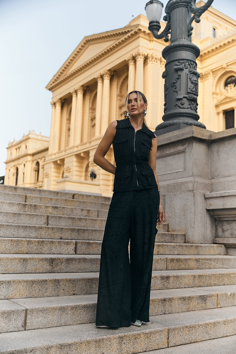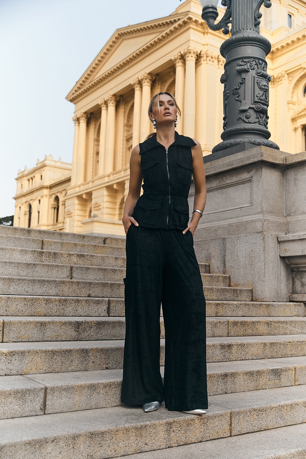 Calça em corte reto com a boca larga, possui bolsos laterais e cós em elástico.