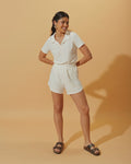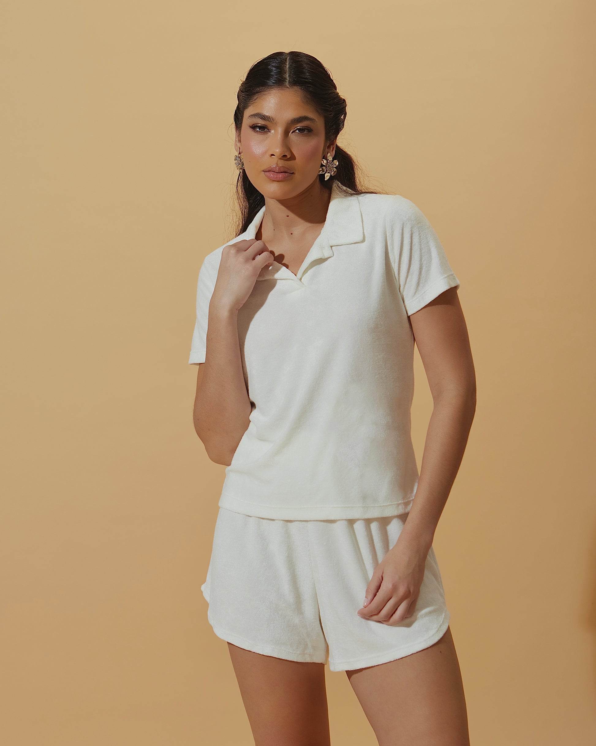 Camiseta gola polo confeccionada em malha atoalhada com manga curta e modelagem slim. Fechamento frontal por três botões em resina.