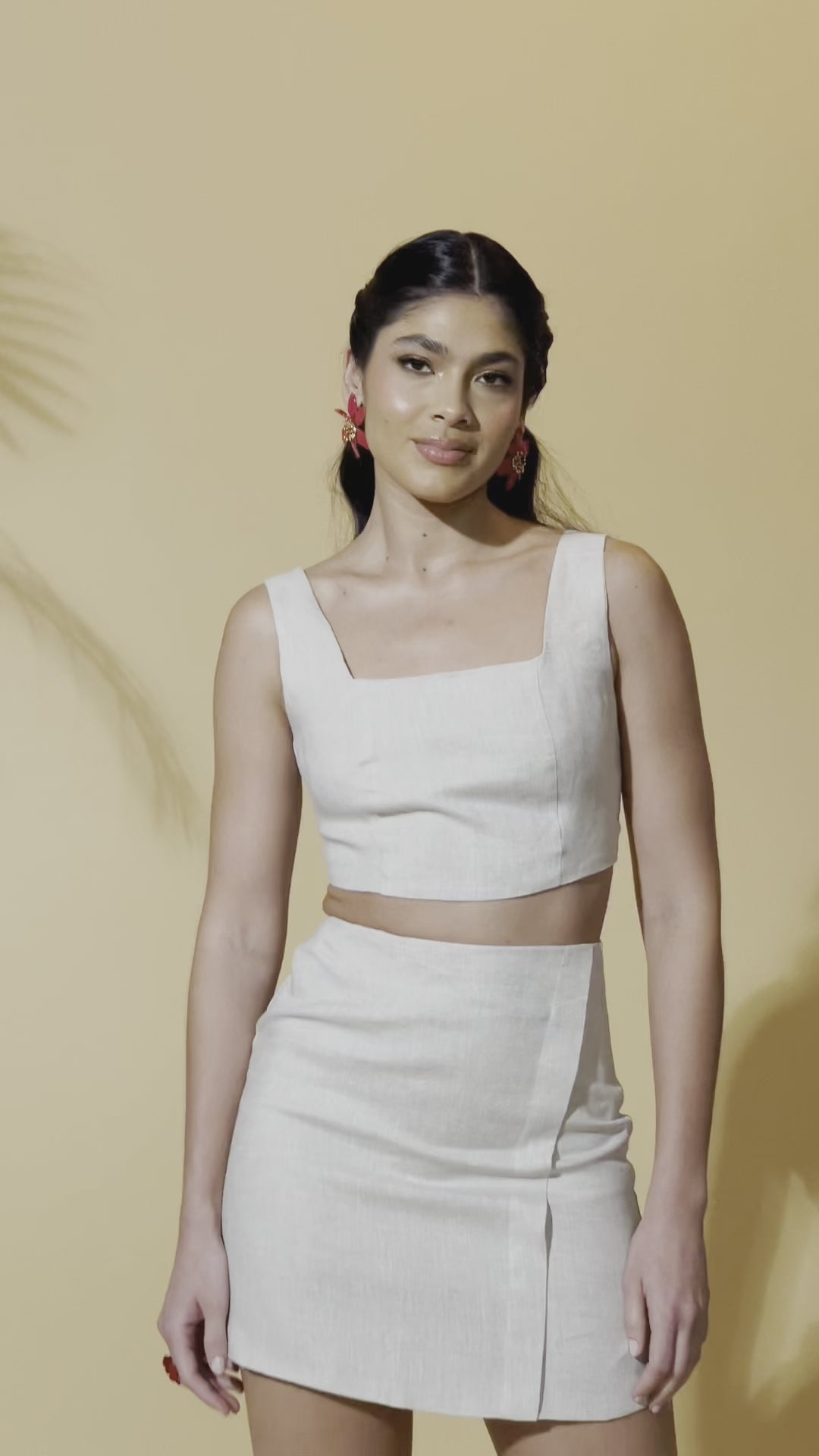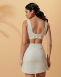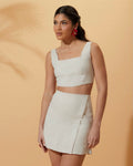 Cropped regata com decote frontal quadrado e decote em U nas costas, fechamento posterior com três botões de pérola resinado. Saia cintura alta e comprimento curto com transpasse na frente e fechamento posterior com zíper invisível