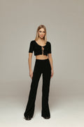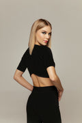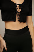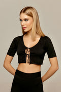 Cropped em malha canelada, com amarração dupla frontal, por duas tiras roletê. Acabamento em viés.