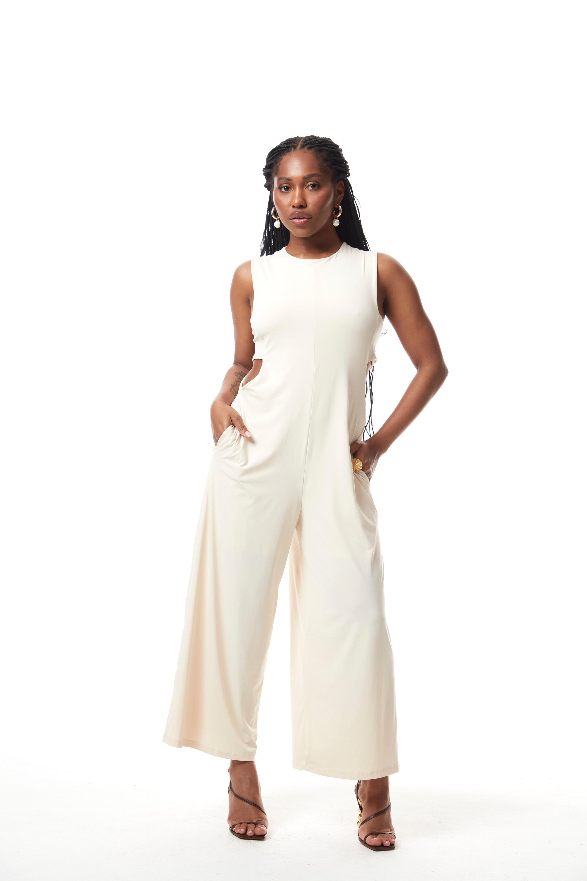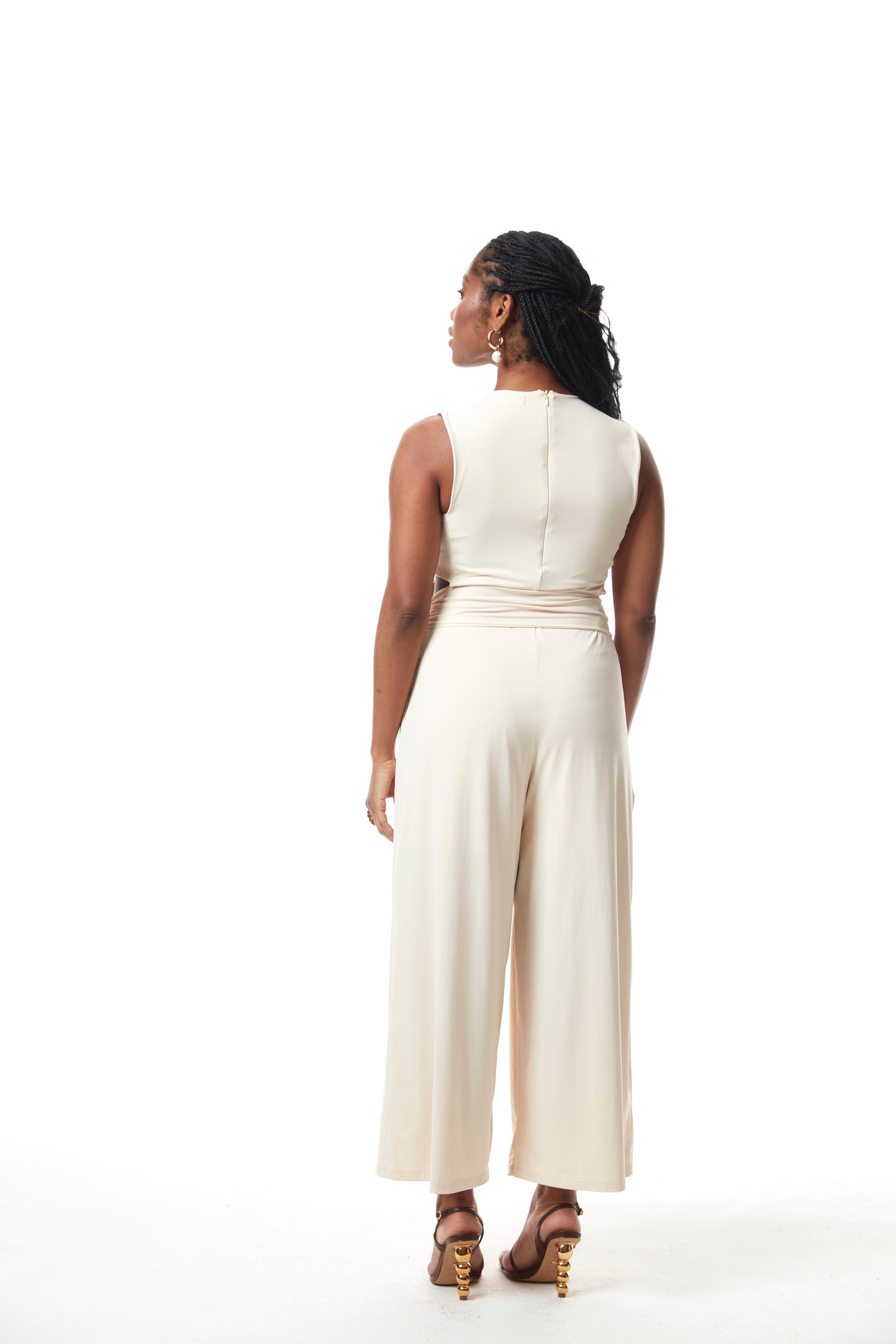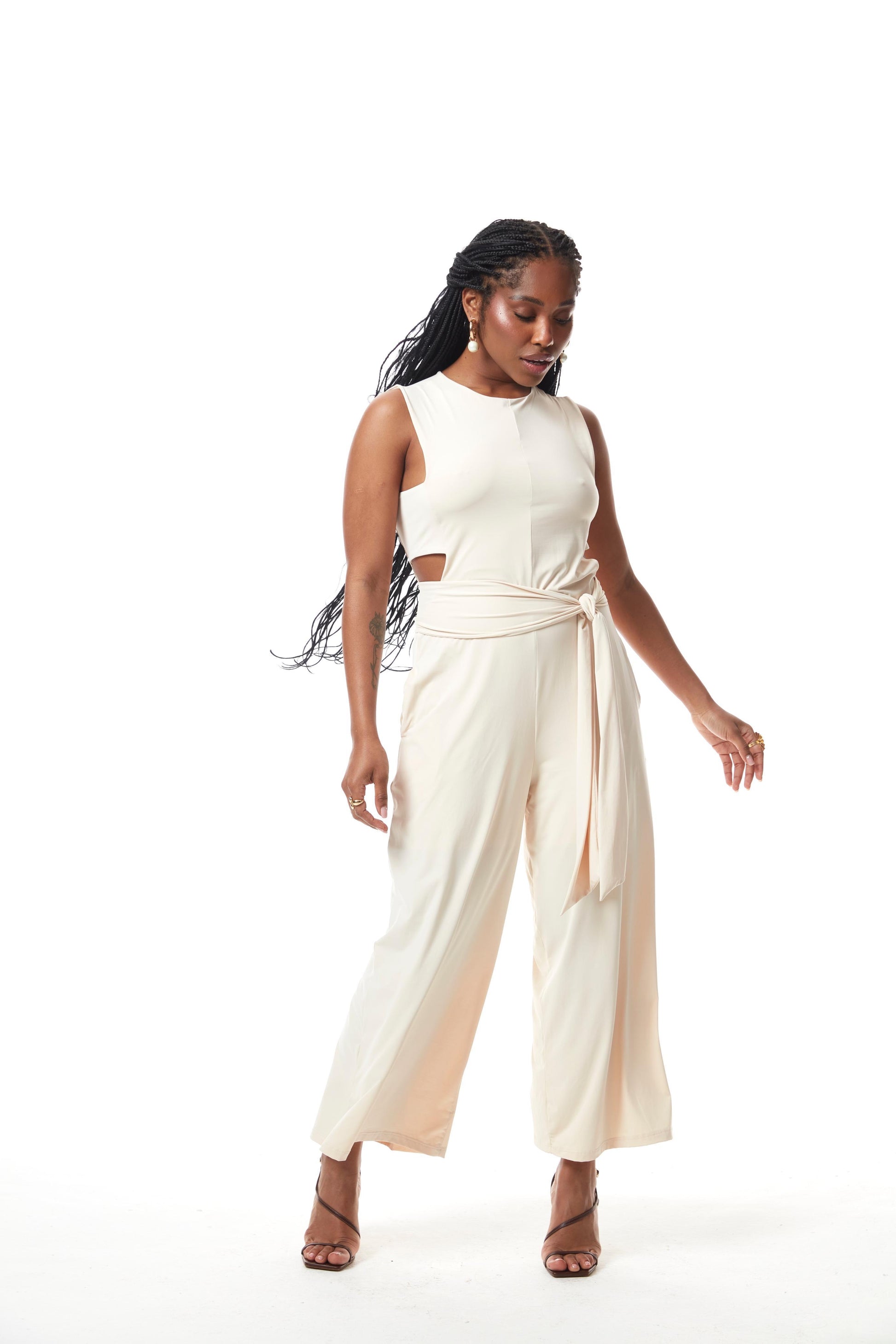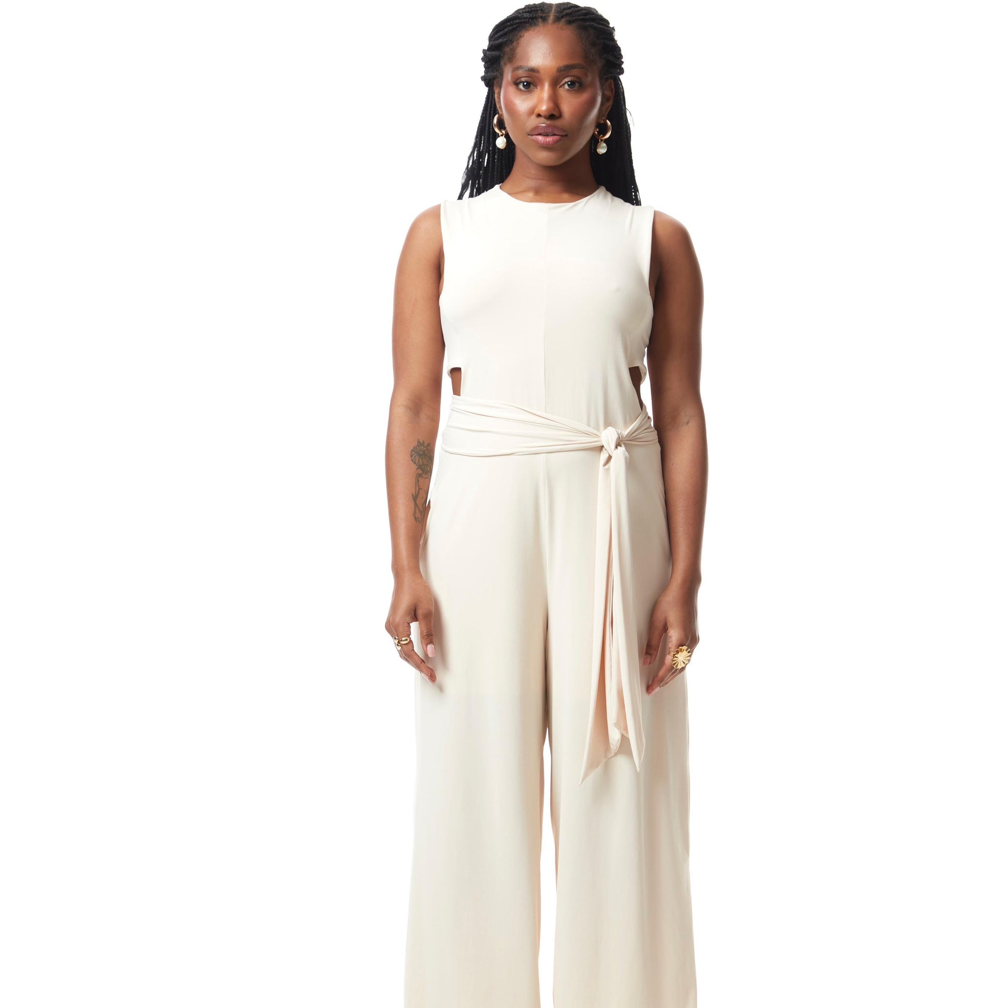 Macacão pantacourt com recorte lateral. Confeccionado em Lycra Adaptiv, confere leveza, conforto e caimento promovendo suavidade e sensação de frescor em contato com a pele. Possui modelagem ampla com comprimento pantacourt, acompanha faixa para amarração.