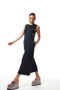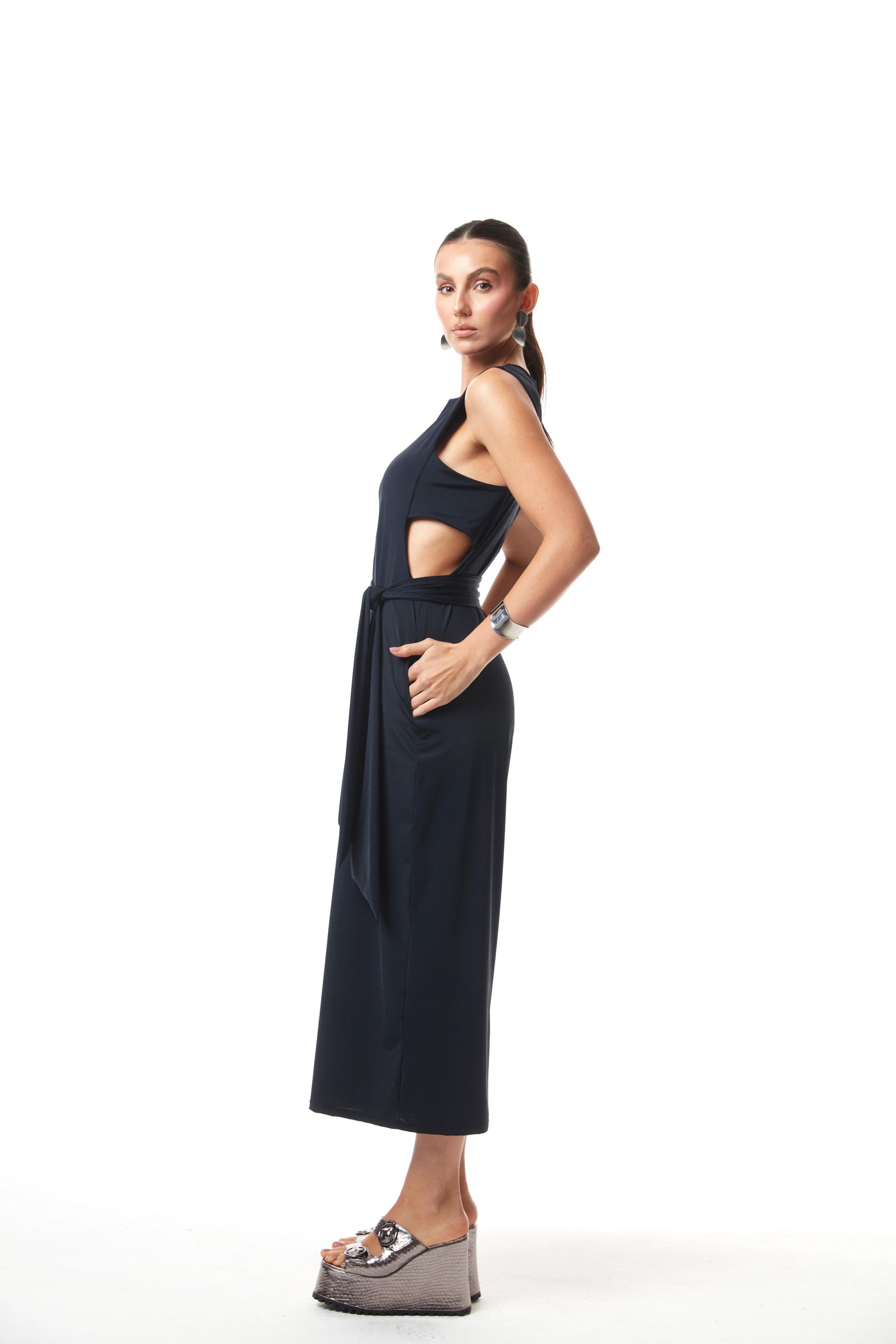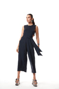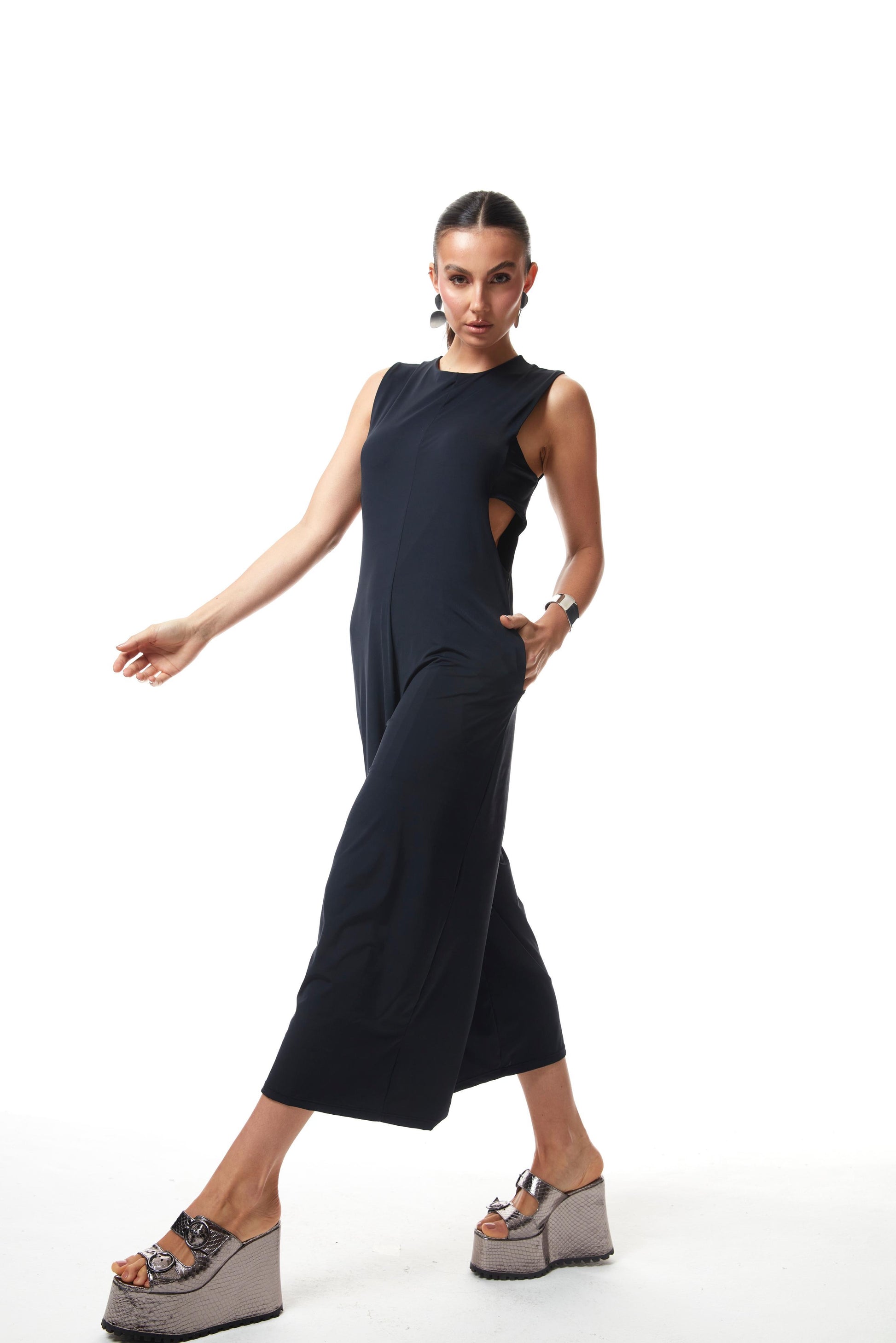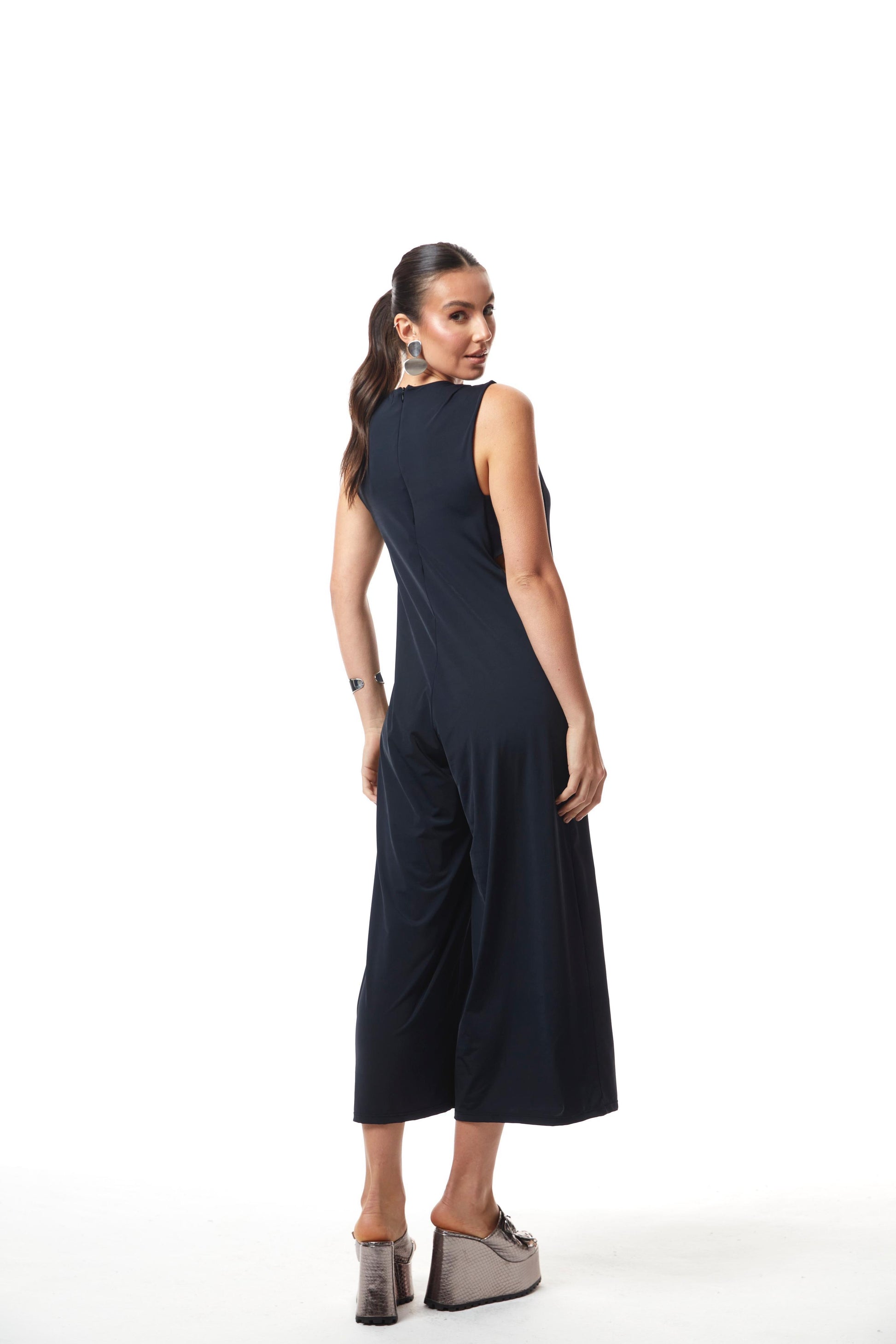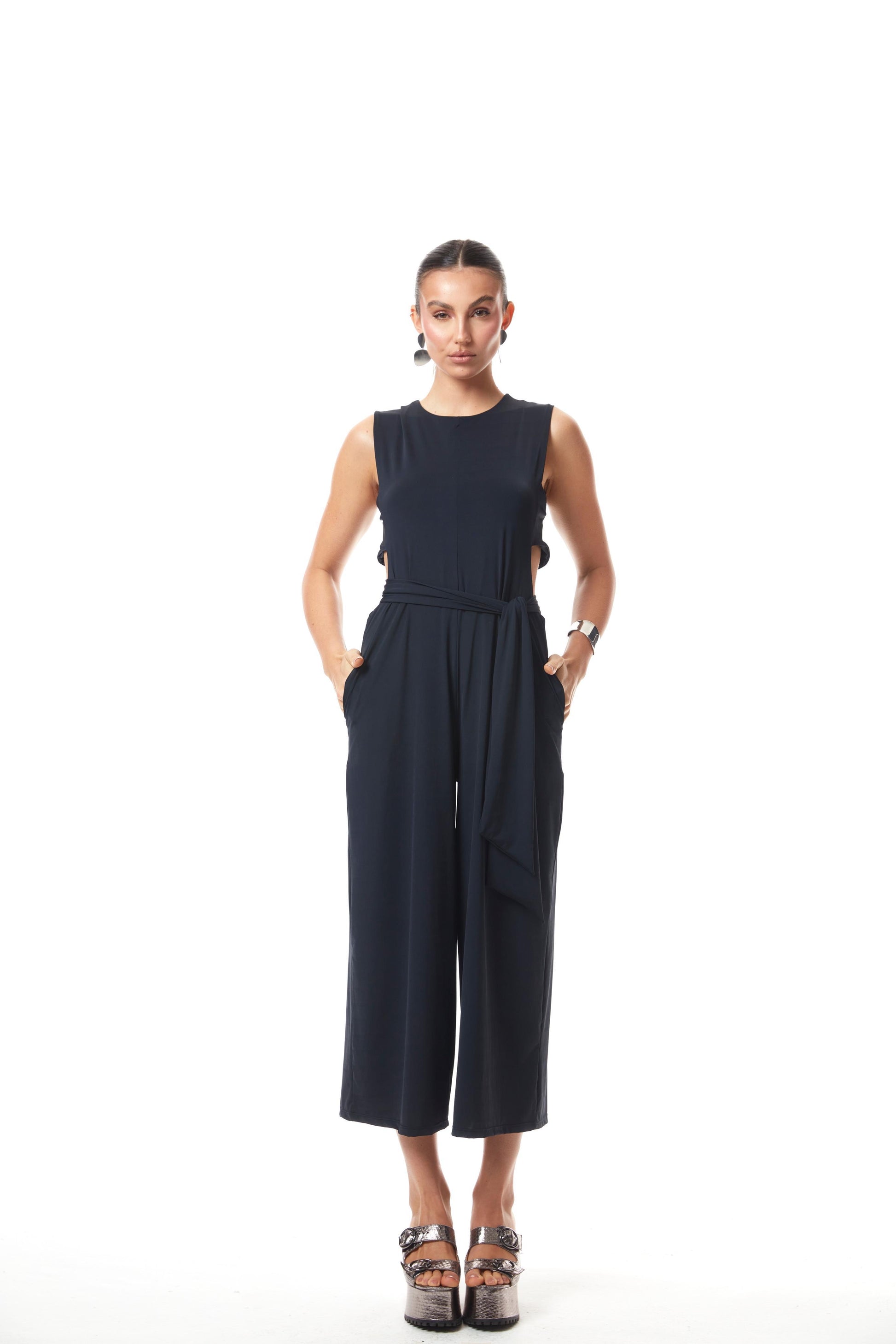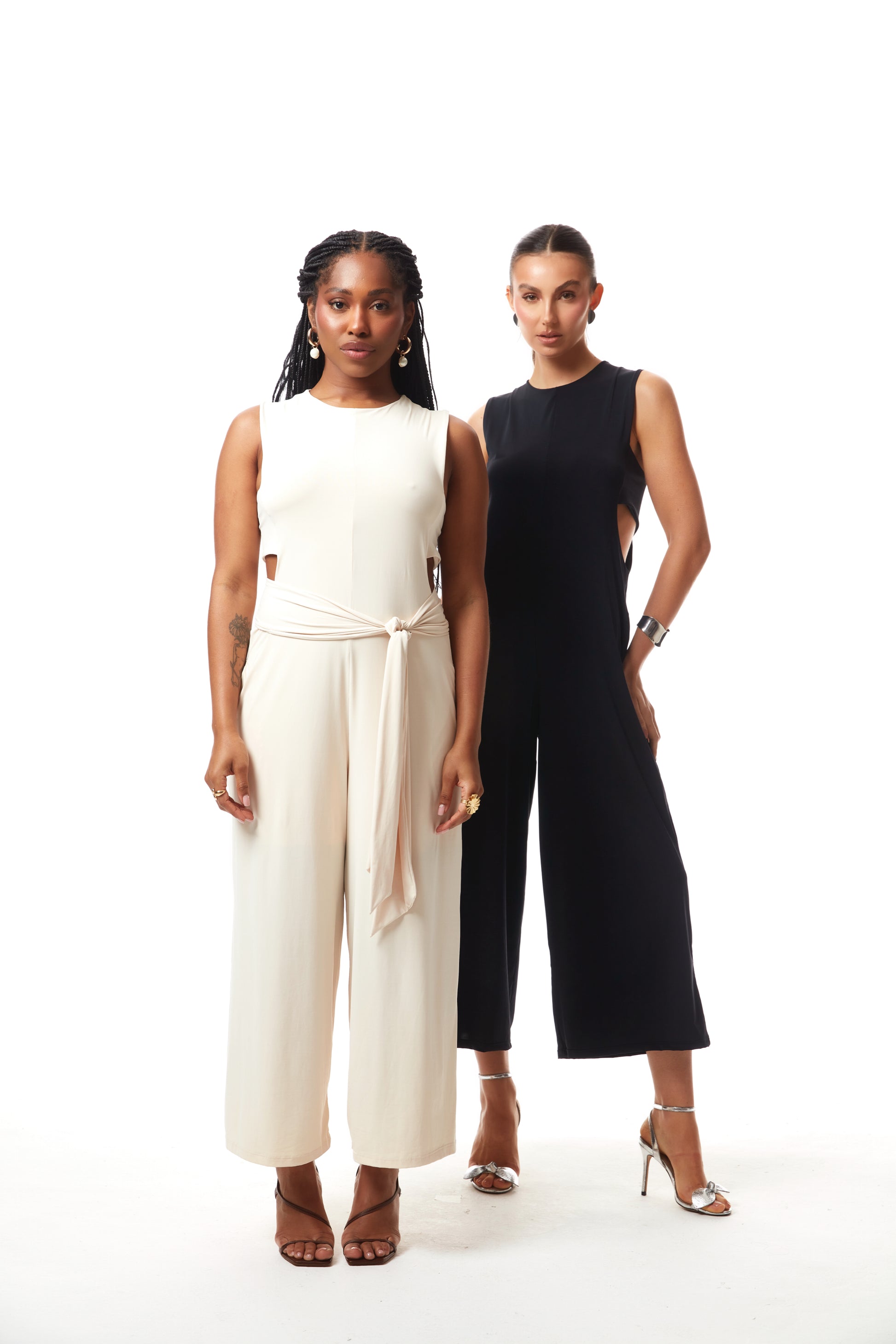 Macacão pantacourt com recorte lateral. Confeccionado em Lycra Adaptiv, confere leveza, conforto e caimento promovendo suavidade e sensação de frescor em contato com a pele. Possui modelagem ampla com comprimento pantacourt, acompanha faixa para amarração.