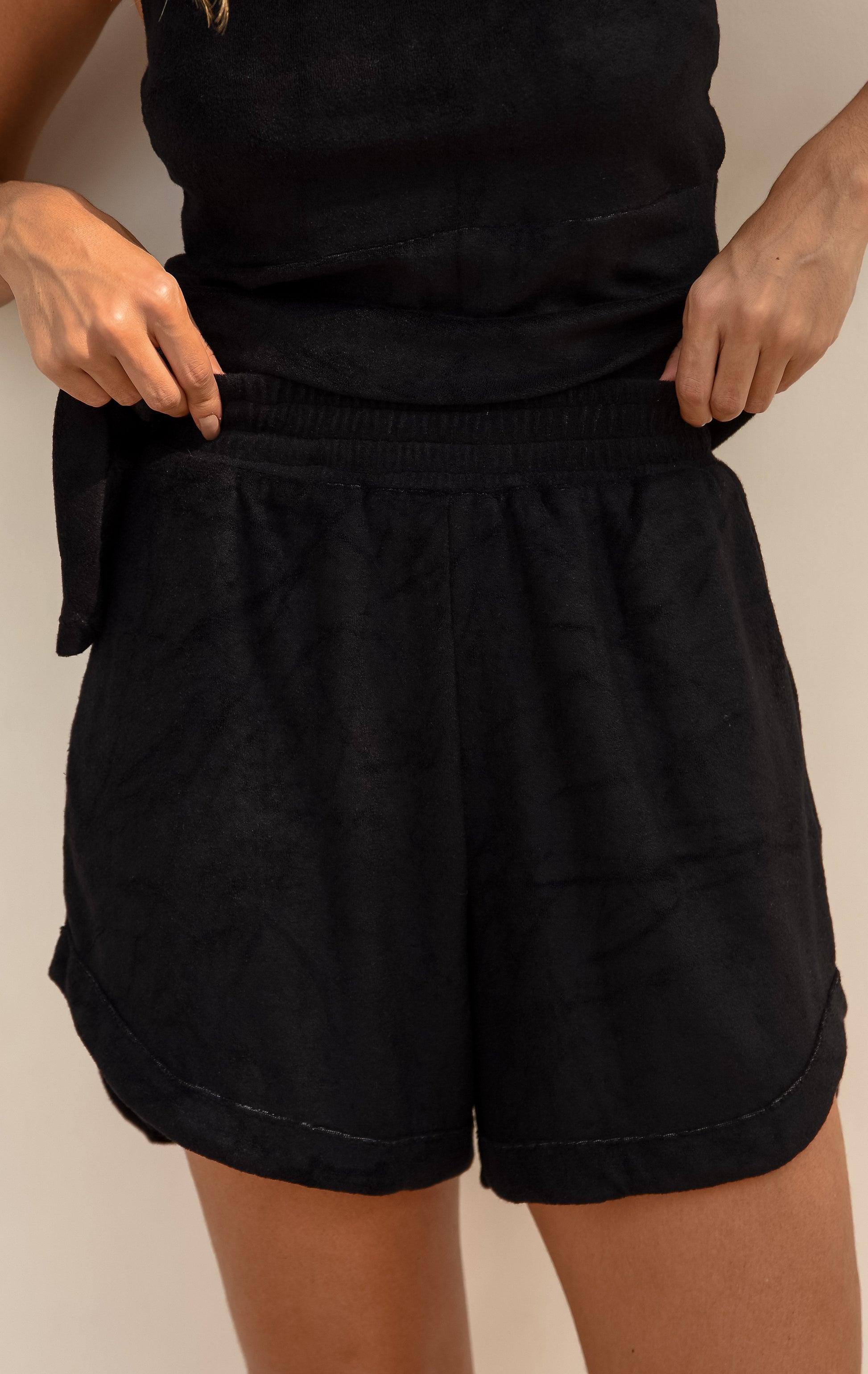 Shorts com modelagem ampla, confeccionado em malha atoalhada, possui cós alto e elástico na cintura. Barra assimétrica sendo a parte da frente mais curta e atrás mais comprido.