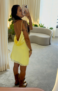 Nosso The Mini Dress é confeccionado em georgette com toque de seda, tecido fluido que confere movimento e sofisticação ao vestir. O decote profundo nas costas e o caimento delicado valorizam o corpo com naturalidade, criando um visual sensual na medida certa.