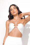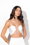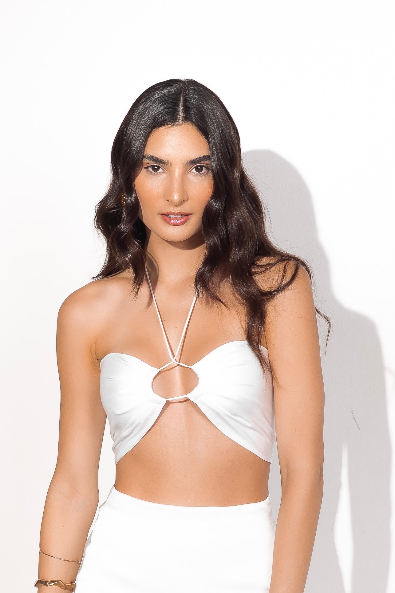 Top com decote frontal arredondado e tira roletê para amarração no pescoço. Forro do mesmo tecido deixando a peça estruturada e sem transparência.