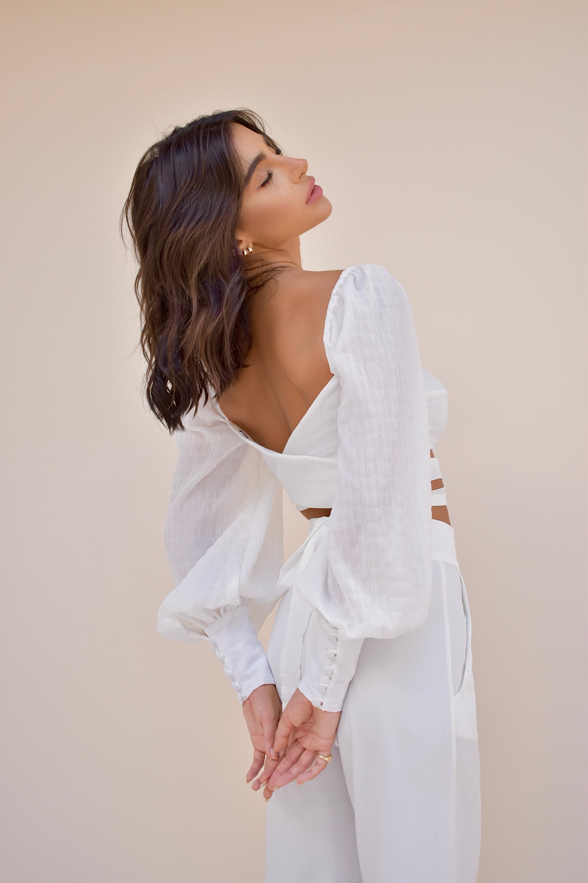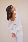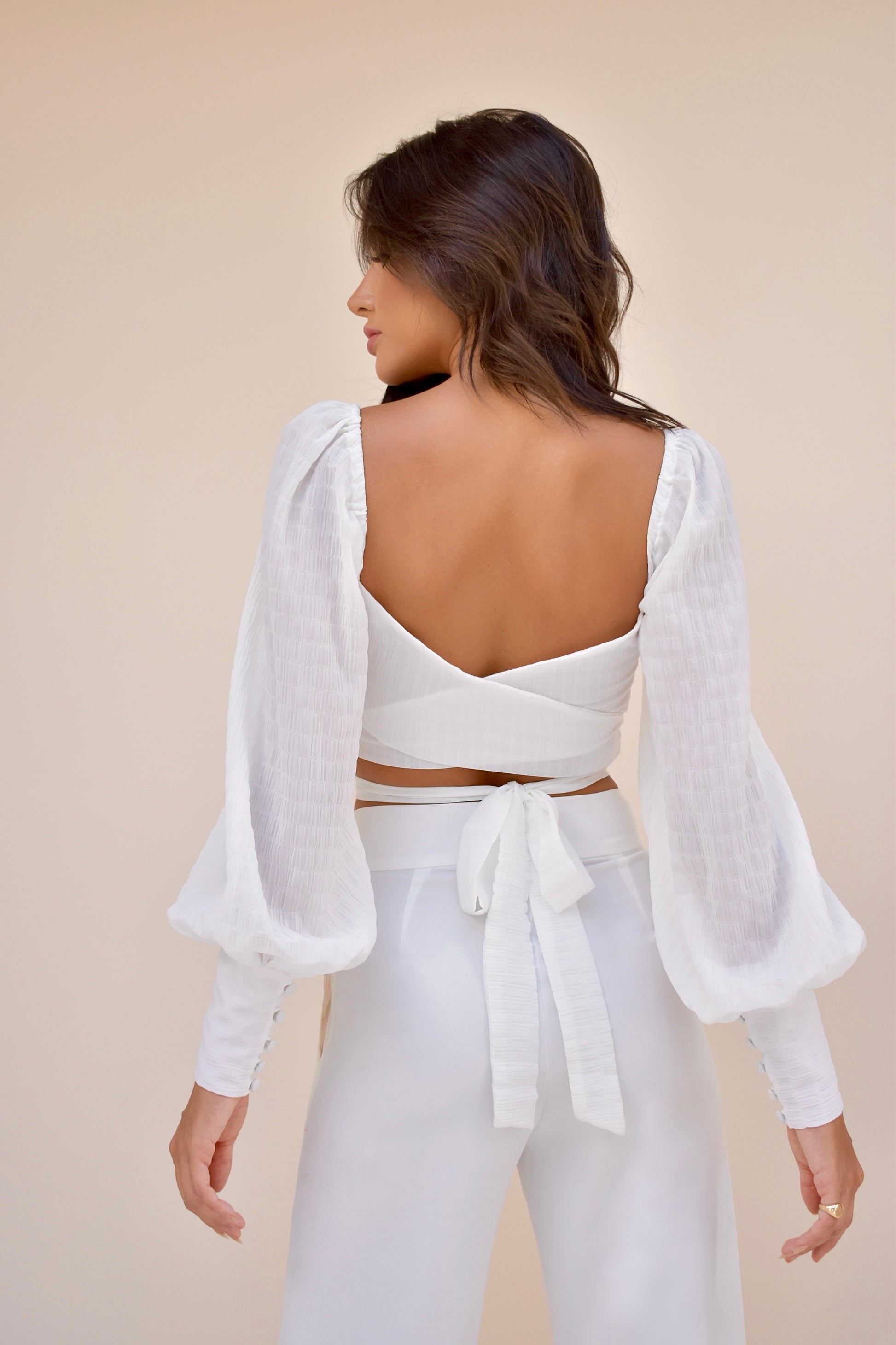 Top em estilo clássico, com mangas bufante e amarração nas costas, possui tecido texturizado e punho justo com botões forrados.