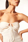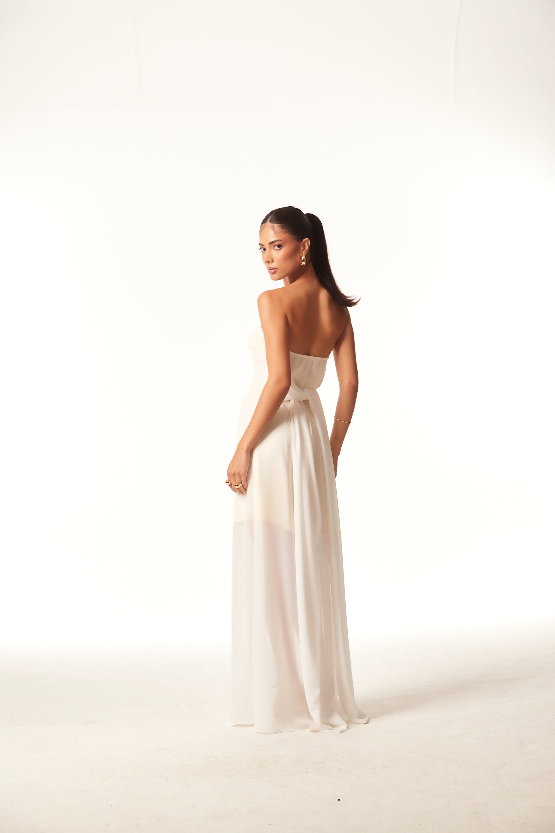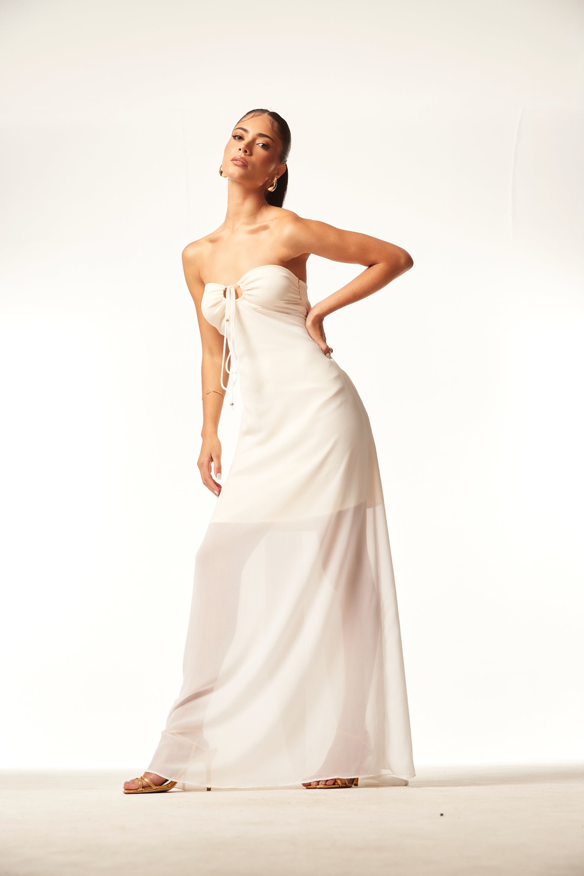 Vestido com corte reto, pode ser usado como um tomara que caia, ou com amarração no pescoço. Possui 2 faixas que possibilitam a amarração de diversas maneiras.