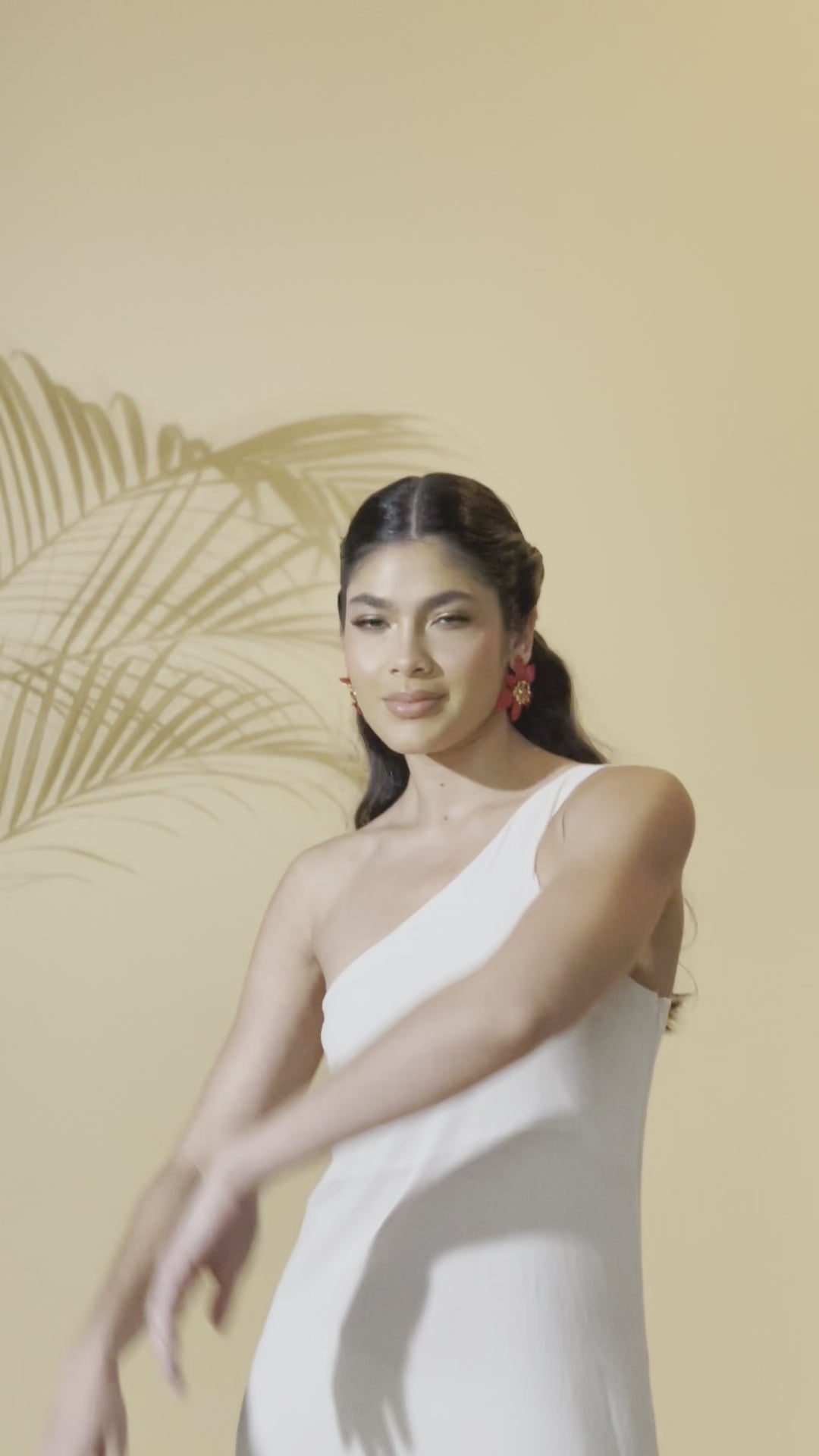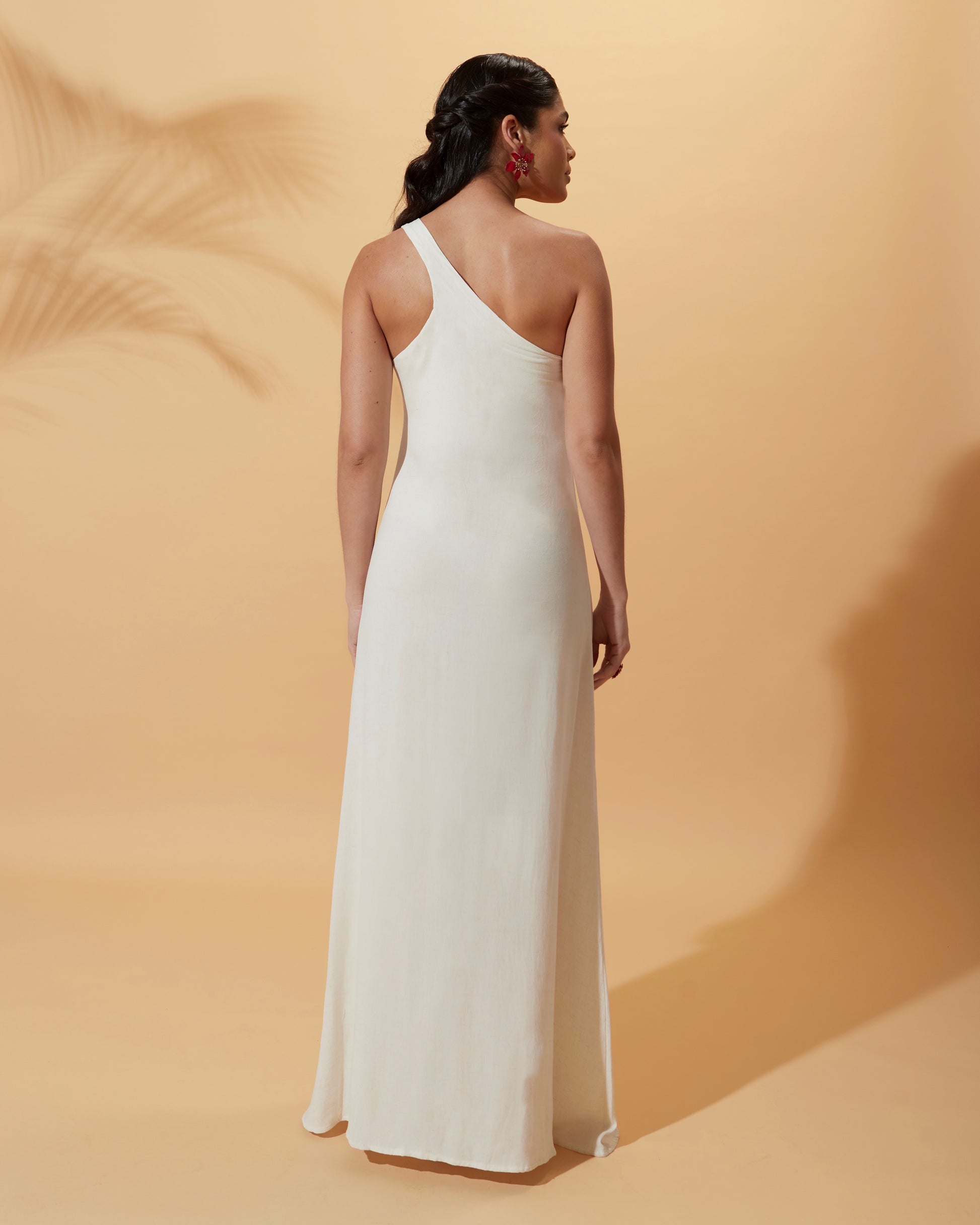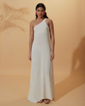 Vestido longo, confeccionado em tecido de linho com viscose com decote transpassado de um ombro só. Modelagem ampla e fechamento lateral por zíper invisível.