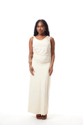 Vestido longo drapeado confeccionado em Lycra Adaptiv, confere leveza, conforto e caimento promovendo suavidade e sensação de frescor em contato com a pele. Possui modelagem justa ao corpo que modela e realça as curvas, decote nas costas e alça torcida em um dos lados.