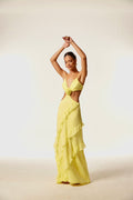 Vestido longo, com flor no centro. Possui decote V na frente e decote também nas costas, sua saia conta com diversos babados em diagonal, que causam um lindo movimento ao caminhar.