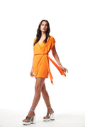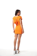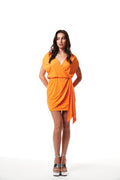 Vestido curto transpassado com gorro. Confeccionado em Lycra Adaptiv, confere leveza, conforto e caimento promovendo suavidade e sensação de frescor em contato com a pele. Possui modelagem transpassada que cria decote em V e faixa embutida na peça criar um nó frontal.