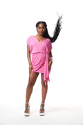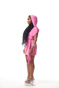 Vestido curto transpassado com gorro. Confeccionado em Lycra Adaptiv, confere leveza, conforto e caimento promovendo suavidade e sensação de frescor em contato com a pele. Possui modelagem transpassada que cria decote em V e faixa embutida na peça criar um nó frontal.