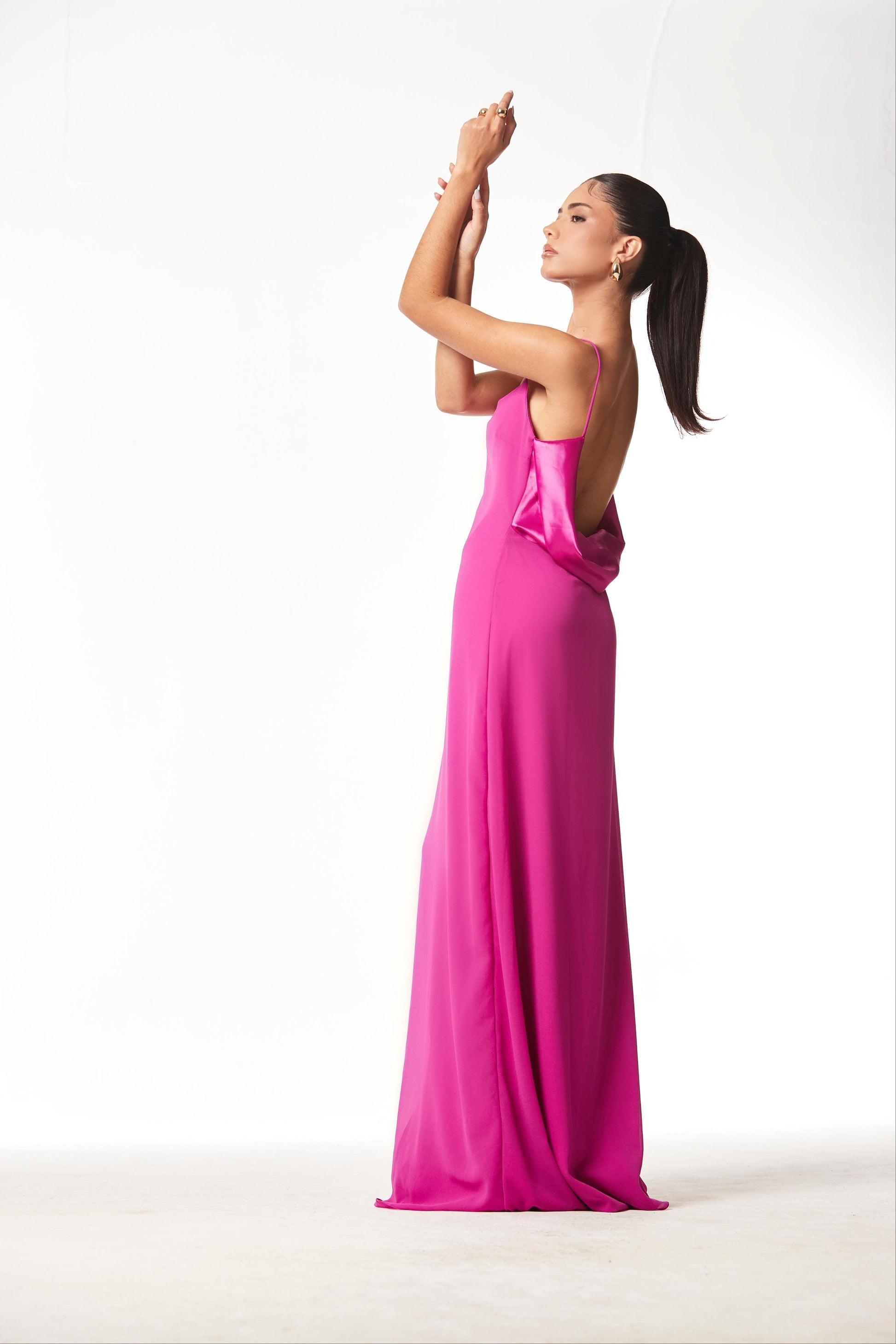 Vestido longo com com corte reto, possui decote profundo nas costas, confeccionado em tecido georgette toque de seda.
