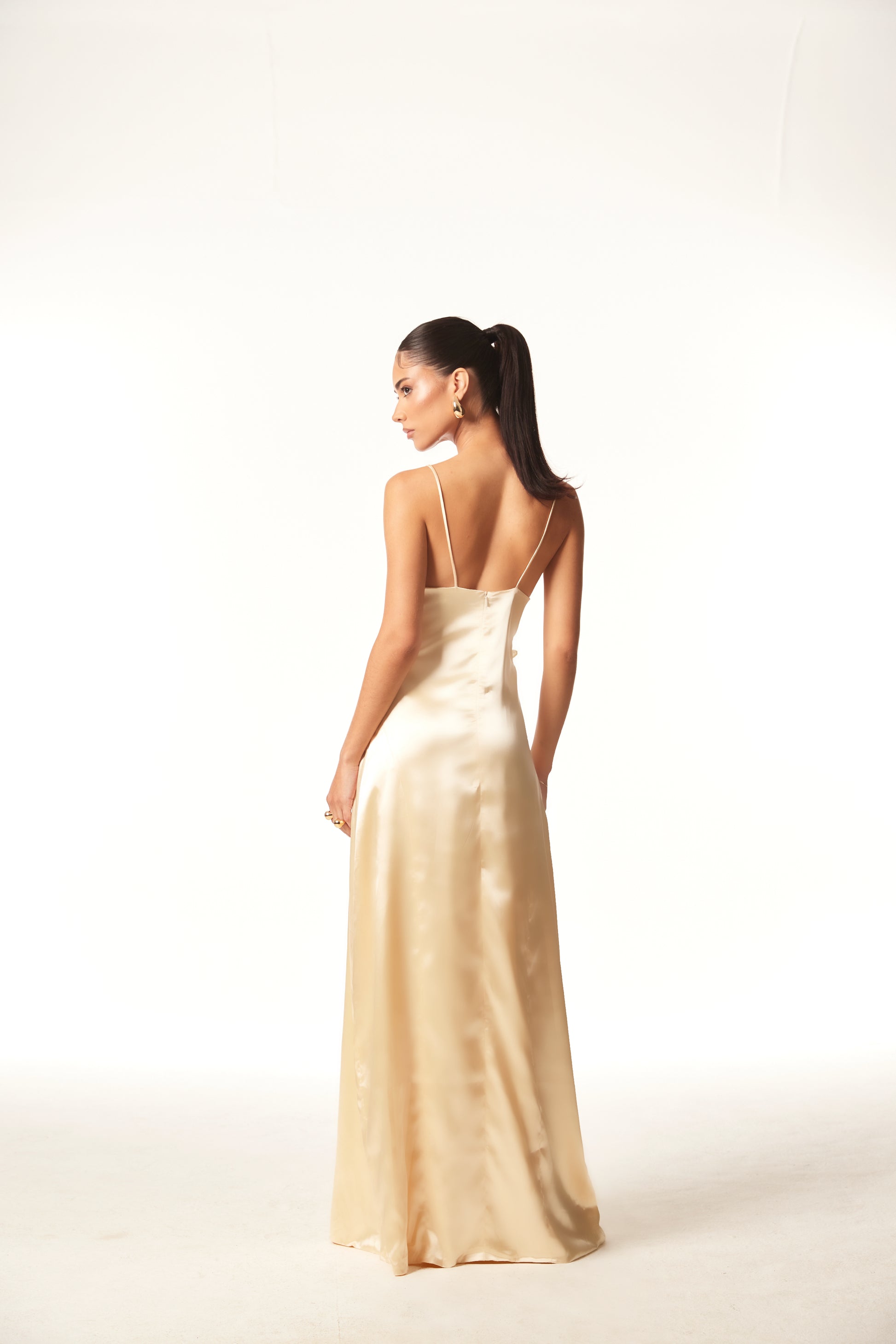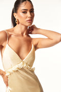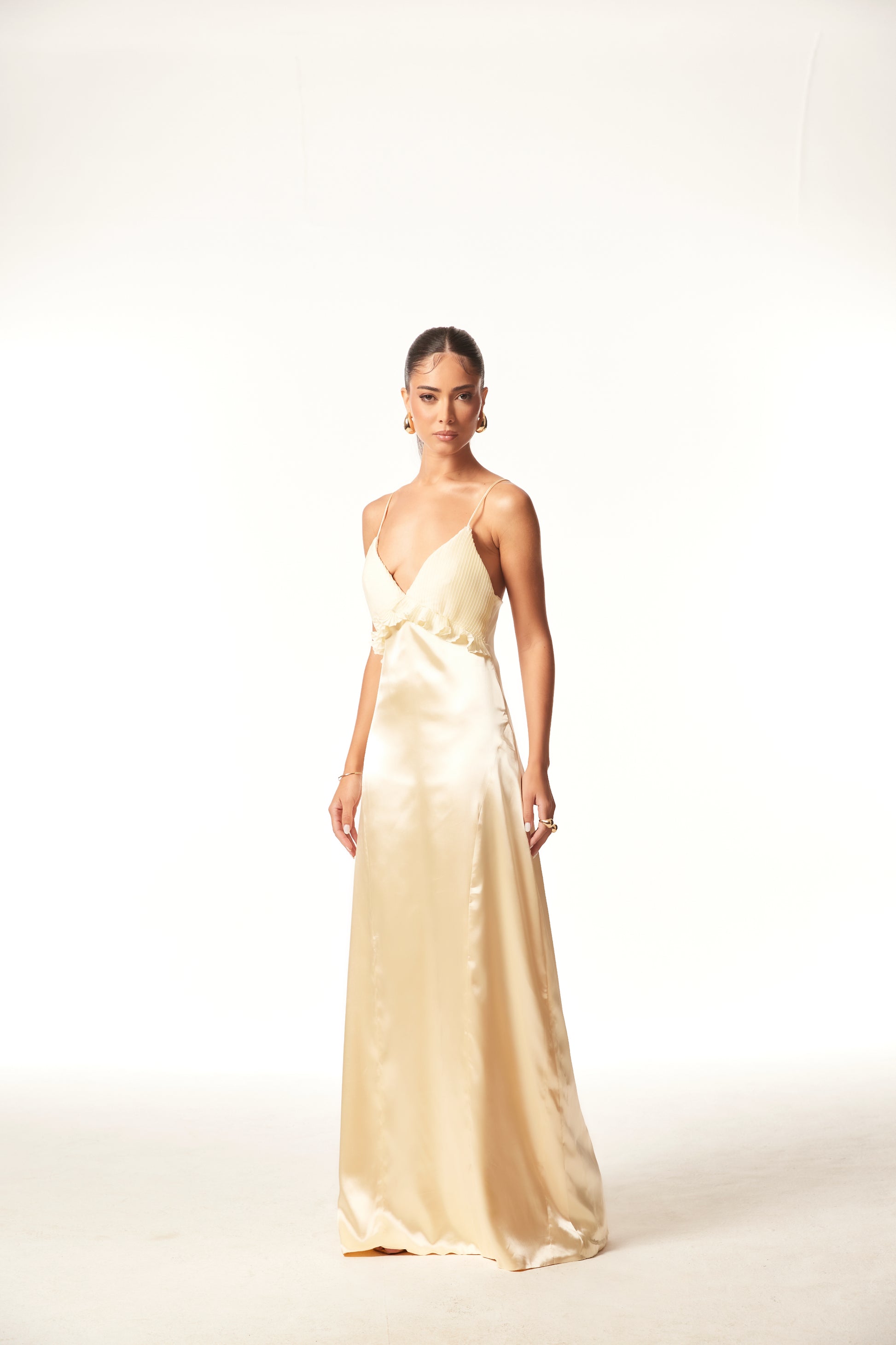 Vestido longo, possui busto em tecido plissado com mini babadinhos abaixo dos seios. Sua saia tem modelagem ampla.