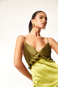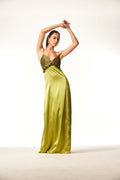 Vestido longo, possui busto em tecido plissado com mini babadinhos abaixo dos seios. Sua saia tem modelagem ampla.